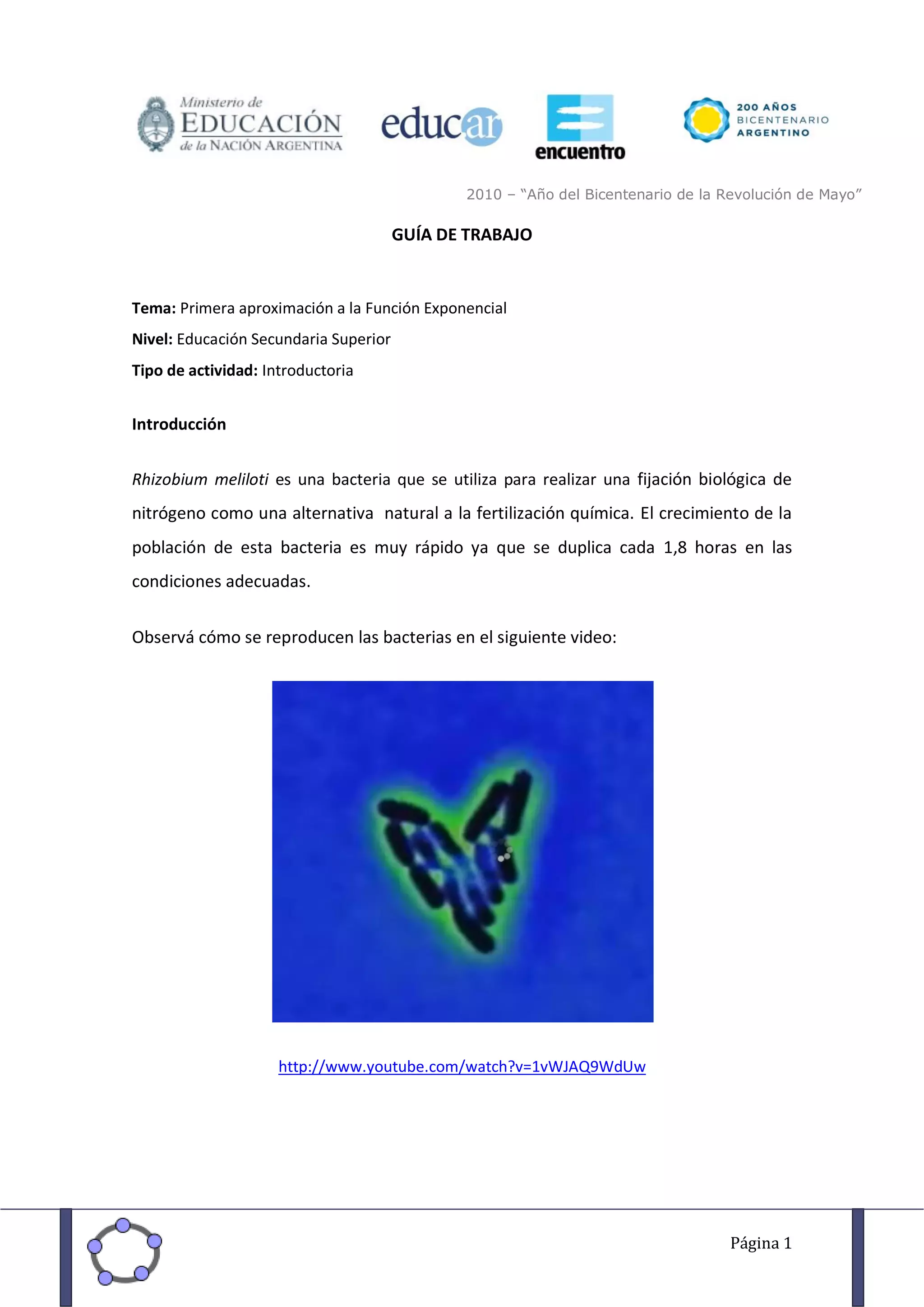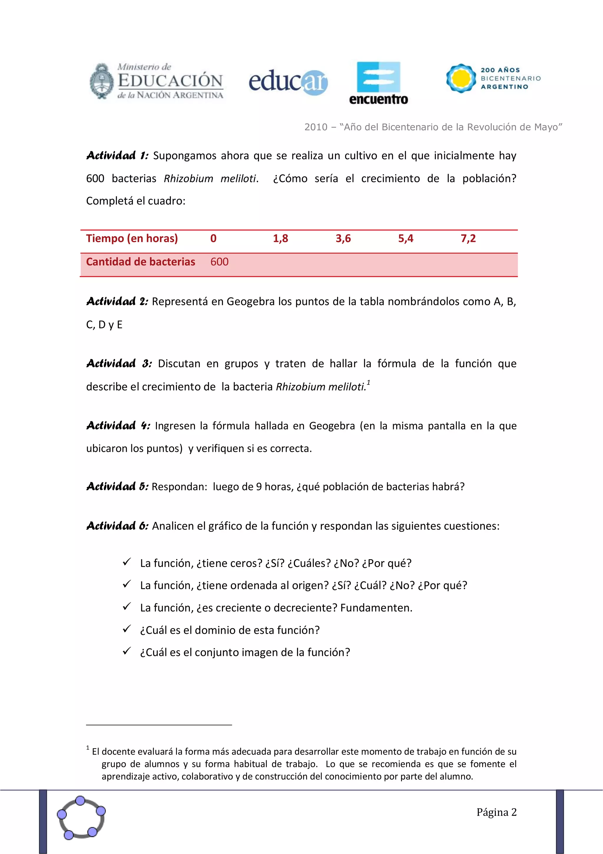 Este documento describe un experimento sobre el crecimiento de la bacteria Rhizobium meliloti. Inicialmente había 600 bacterias y se duplican cada 1.8 horas. El documento propone 6 actividades para que los estudiantes determinen la función exponencial que describe el crecimiento bacteriano, representen gráficamente los datos y analicen propiedades de la función exponencial.