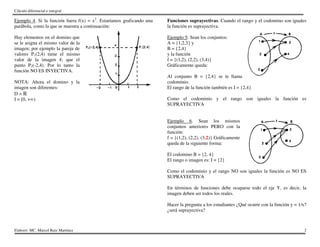 Este documento explica los conceptos de funciones inyectivas, suprayectivas y biyectivas. Define dominio, codominio e imagen de una función. Una función es inyectiva si cada elemento de la imagen solo se asocia con un elemento del dominio. Es suprayectiva si el codominio y la imagen son iguales. Es biyectiva si es a la vez inyectiva y suprayectiva. Proporciona ejemplos para ilustrar estos conceptos y sugiere prácticas de ejercicios para los estudiantes.