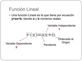 La función lineal se representa como y=ax+b, donde a es la pendiente y b es la ordenada al origen. La pendiente indica si la recta es creciente, decreciente o constante, mientras que la ordenada al origen es el punto donde la recta corta el eje y. Dos rectas son paralelas si tienen la misma pendiente y perpendiculares si el producto de sus pendientes es -1.