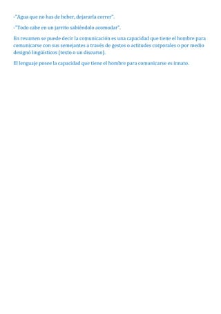 Las funciones lingüísticas en un acto de comunicación pueden ser emociva (expresar emociones del hablante), conativa (influir en el oyente), referencial (proveer información sobre la realidad), fática (iniciar, prolongar o interrumpir la comunicación), metalingüística (proveer información sobre el código), y poética (usar el lenguaje con fines estéticos). La comunicación es la capacidad humana de interactuar mediante gestos, actitudes o lenguaje.
