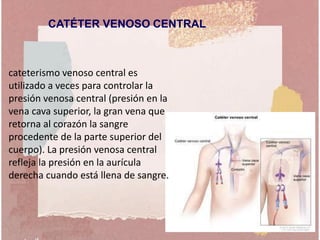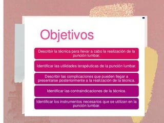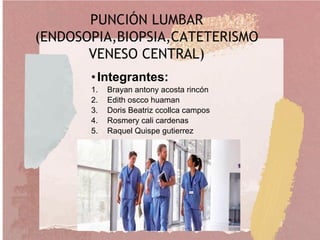Este documento describe los procedimientos de punción lumbar, cateterismo venoso central, biopsia e incluye información sobre los materiales, indicaciones, contraindicaciones y cuidados de enfermería de cada uno. Se explican los pasos para realizar una punción lumbar, como la posición del paciente, anestesia de la zona y recolección de la muestra de líquido cefalorraquídeo. También se detallan los tipos de acceso venoso central y las ventajas de tener un catéter venoso central.