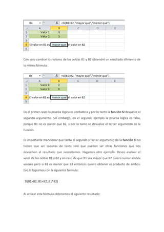 Este documento explica las funciones SI y BUSCARV en Excel. La función SI evalúa una prueba lógica y devuelve un valor dependiendo del resultado. La función BUSCARV busca un valor en una tabla y devuelve la celda coincidente. Ambas funciones requieren que los datos estén organizados de forma vertical y que la primera columna contenga valores únicos para identificar filas de manera única.