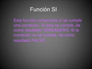 Esta función comprueba si una condición es verdadera o falsa y devuelve un resultado u otro. La sintaxis es SI(condición; resultado si es verdadero; resultado si es falso). Usa operadores de comparación como =, <, > para establecer la condición. Los resultados pueden ser constantes numéricas o cadenas entrecomilladas. El separador de argumentos depende de si se usan puntos o comas para separar decimales.
