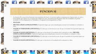 Estas tres funciones de Excel (SI, BUSCARV, BUSCARH) permiten realizar comparaciones lógicas, buscar valores específicos dentro de una matriz de datos y encontrar información en filas y columnas particulares. La función SI devuelve un resultado dependiendo de si una prueba lógica es verdadera o falsa, mientras que BUSCARV y BUSCARH buscan valores en rangos y tablas. Juntas, estas funciones pueden ser útiles para análisis de datos y toma de decisiones basadas en condiciones.