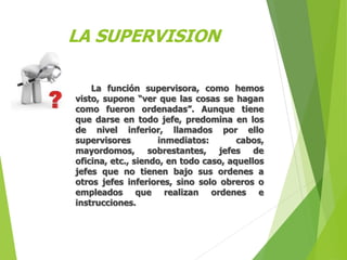 El documento describe las funciones y características de un supervisor. Un supervisor planea, organiza, lidera, controla y desarrolla a los empleados para mejorar la productividad y rentabilidad. Sus funciones incluyen identificar riesgos para la salud de los trabajadores y evaluar los procesos y métodos de trabajo. Un buen supervisor tiene conocimiento técnico, habilidades para instruir y motivar, y la capacidad de resolver problemas de manera efectiva.