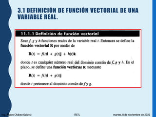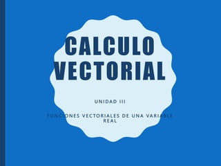 El documento trata sobre funciones vectoriales de una variable real. Explica la definición de estas funciones, su graficación, derivación y propiedades, integración, longitud de arco, vectores tangente, normal y binormal, y curvatura. También incluye tareas para aplicar estos conceptos.