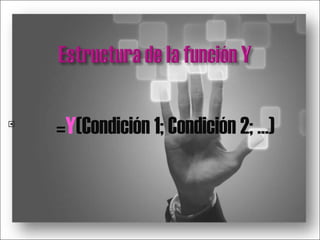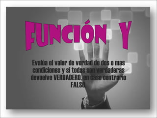 La función Y evalúa si varias condiciones son verdaderas y devuelve verdadero solo si todas lo son. Se usa para determinar si un estudiante puede participar en un campeonato de atletismo si cumple con tres condiciones: ha entrenado más de dos meses, tiene un promedio mayor a 3.5, y su examen físico lo determina apto.