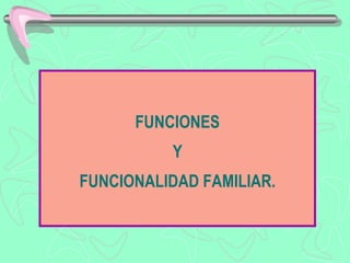 Este documento describe las funciones y funcionalidad de la familia como contexto de desarrollo personal. Explora las características de familias funcionales versus disfuncionales, incluyendo las relaciones, comunicación, organización y apoyo social. También detalla las etapas para abordar problemas familiares, como definir el problema, establecer metas y seleccionar tácticas para lograr un cambio positivo.