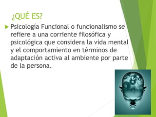 El funcionalismo considera la mente y el comportamiento en términos de adaptación al ambiente. Surgió en Estados Unidos a finales del siglo XIX como una alternativa al estructuralismo, enfocándose en las funciones de la mente y su adaptación. Los funcionalistas se oponían a la descripción estática de la mente del estructuralismo y querían que la psicología estudiara cómo la mente favorece la adaptación y supervivencia. Algunos autores funcionalistas clave fueron William James, John Dewey y James Angell.