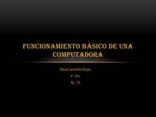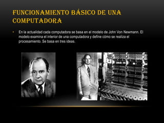 El documento describe el funcionamiento básico de una computadora según el modelo de Von Neumann. Este modelo define a una computadora como cuatro subsistemas: memoria, unidad lógica aritmética, unidad de control y entrada/salida. El modelo establece que los programas deben almacenarse en la memoria y ser ejecutados secuencialmente por la unidad de control a través de instrucciones almacenadas.