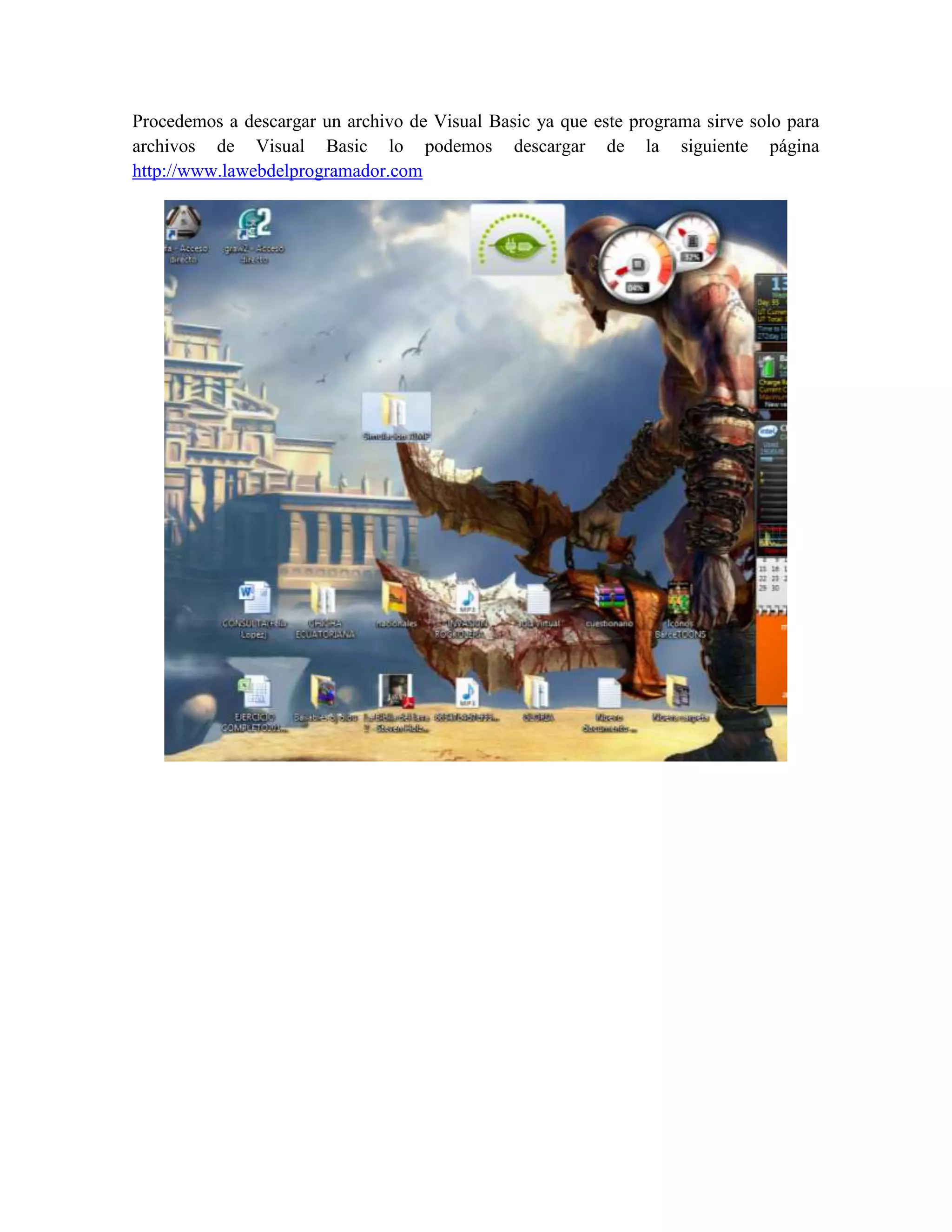 Este documento proporciona instrucciones para usar el programa VbDecompiler para descompilar archivos de Visual Basic. Explica cómo descargar e instalar VbDecompiler, luego descargar un archivo de VB para descompilar. Detalla los pasos de abrir el archivo VB en VbDecompiler, que descompilará el código y lo mostrará.