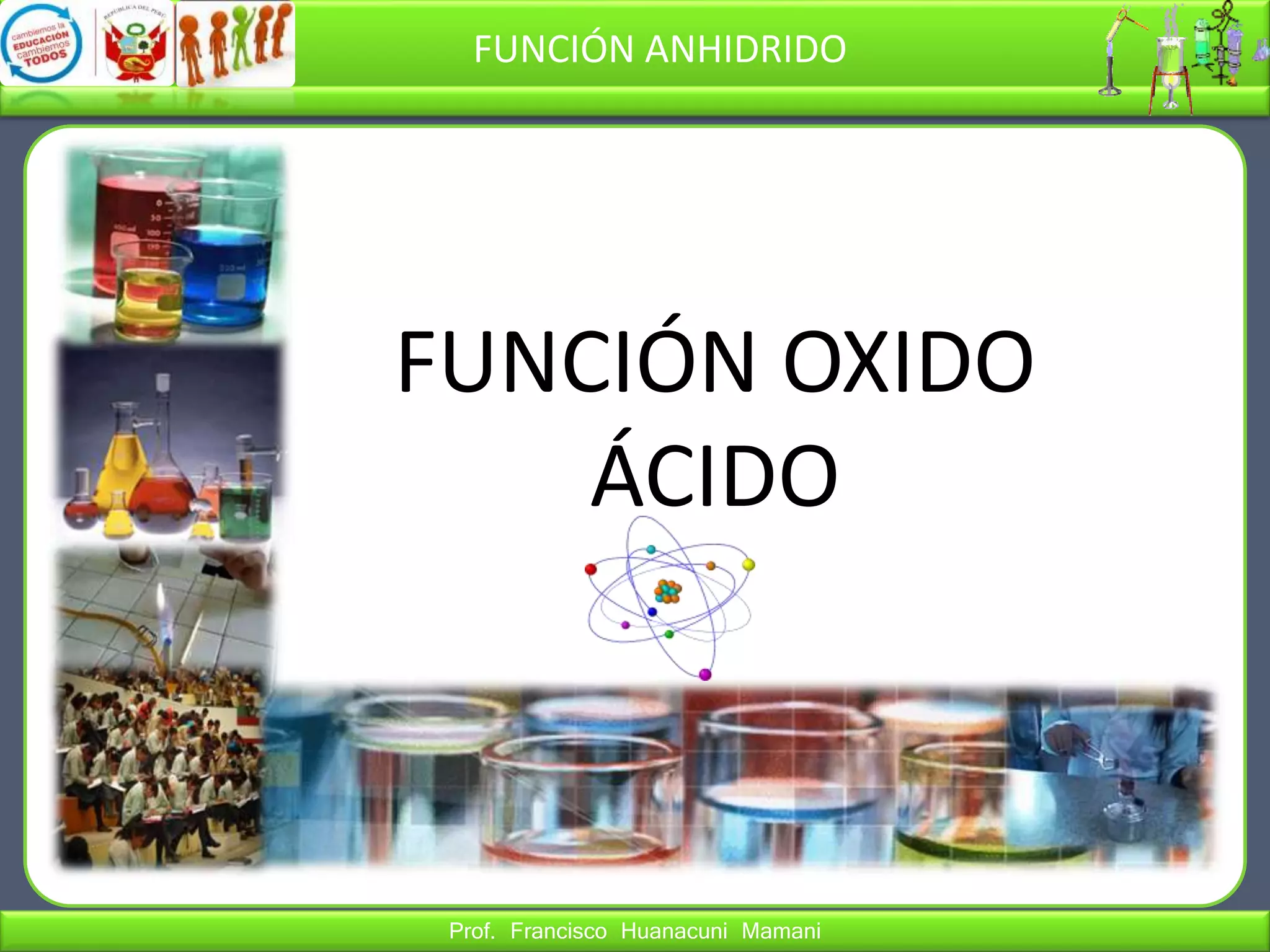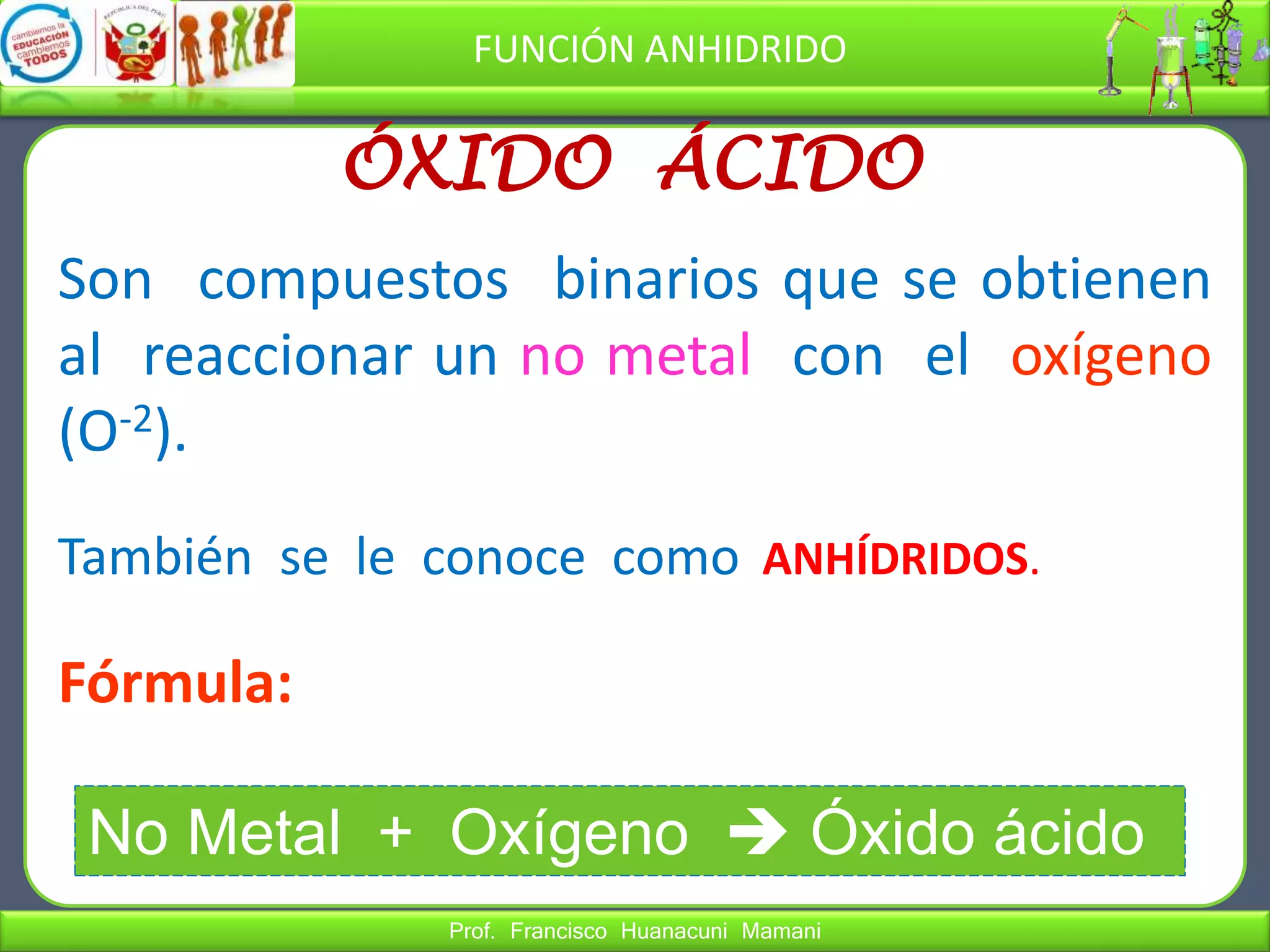 El documento describe los óxidos ácidos o anhídridos, compuestos binarios formados por la reacción de un no metal con oxígeno. Explica que son gases covalentes que producen ácidos en presencia de agua y sales en presencia de bases. También presenta las nomenclaturas tradicional y IUPAC para estos compuestos y ejemplos de su aplicación.