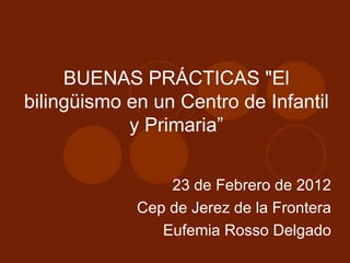 Este documento proporciona información sobre las buenas prácticas del bilingüismo en un centro de educación infantil y primaria. Explica los principios básicos del AICLE/CLIL, como el uso de la lengua para aprender contenidos y comunicarse, y la importancia de un input comprensible. También describe estrategias metodológicas como el trabajo en grupos, el uso de recursos digitales y el enfoque en tareas. Finalmente, incluye ejemplos de actividades y recursos útiles para la enseñanza bilingüe.
