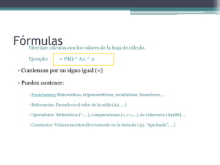 Este documento describe las fórmulas y funciones en Microsoft Excel. Las fórmulas realizan cálculos con los valores de la hoja de cálculo utilizando funciones, referencias a celdas, operadores y constantes. Las funciones son fórmulas predefinidas que operan sobre valores llamados argumentos y pueden anidarse unas dentro de otras. Los argumentos pueden ser constantes, celdas, rangos de celdas o combinaciones de estos y son los valores que recibe la función. Excel incluye funciones numéricas, de fecha y hora, financieras