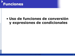 Este documento presenta varias funciones de PL/SQL como funciones de conversión, funciones matemáticas, funciones para el manejo de fechas, cadenas y grupos de valores. Explica cómo usar la tabla DUAL de Oracle y cómo declarar y usar registros y tipos de registros. También muestra ejemplos de uso de funciones avanzadas como DECODE y CASE. El objetivo es proporcionar una referencia sobre las funciones más comunes de PL/SQL.