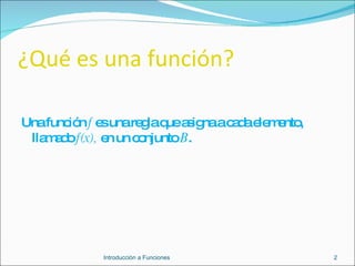 Este documento trata sobre funciones. Explica qué es una función y cómo se pueden representar funciones de manera verbal, algebraica, gráfica y numérica. También describe gráficas de funciones, funciones crecientes y decrecientes, transformaciones de funciones como desplazamientos y reflexiones, y conceptos como funciones cuadráticas, máximos y mínimos, modelado con funciones, composición e inversión de funciones.
