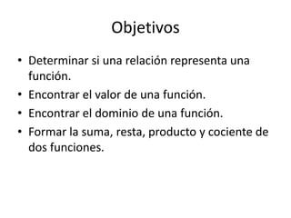 ObjetivosDeterminar si unarelación representa una función.Encontrar el valor de una función.Encontrar el dominio de una función.Formar la suma, resta, producto y cociente de dos funciones.