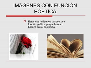El documento describe diferentes tipos de funciones que pueden tener las imágenes, incluyendo funciones informativas, poéticas, persuasivas, fáticas, así como discutiendo imágenes con originalidad vs redundancia, imágenes simples vs compuestas, e imágenes con monosemia vs polisemia.
