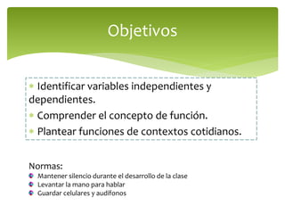 La profesora Viviana Muñoz presenta los objetivos de identificar variables independientes y dependientes, comprender el concepto de función y plantear funciones de contextos cotidianos. Se revisan conceptos sobre expresiones algebraicas y se define función como una relación entre variables x e y donde a cada valor de x corresponde un único valor de y. Finalmente, se explican los conceptos de dominio y recorrido de una función.