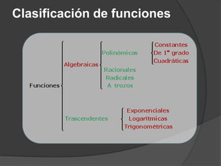 El documento clasifica diversas funciones algebraicas, incluyendo funciones explícitas, implícitas, polinómicas, constantes, lineales, cuadráticas y cúbicas, entre otras. También se analizan funciones racionales, de trozos, trascendentes y trigonométricas, detallando sus características y gráficos. Proporciona ejemplos y métodos para representar gráficamente estas funciones.