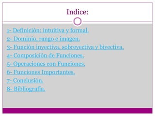 Este documento define funciones, dominio, rango e imagen, funciones inyectivas, sobreyectivas y biyectivas, composición y operaciones con funciones, y funciones importantes como funciones lineales, cuadráticas, exponenciales y logarítmicas. También resume los programas aprendidos en la materia Estructuras de Programación y concluye que el curso fue importante para reforzar conocimientos sobre tecnología y computación.