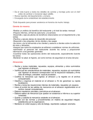 El documento describe los roles y responsabilidades de varios puestos en un restaurante, incluyendo el gerente general, gerente de meseros, almacenista y meseros. También incluye información sobre investigación de mercado y una lista de proveedores potenciales con sus requisitos.