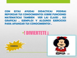Este documento ofrece ayudas didácticas para reforzar los conocimientos sobre funciones matemáticas. Explica conceptos clave como dominio, codominio, rango e incluye ejemplos de diferentes tipos de funciones como lineales, cuadráticas y raíz cuadrada. También incluye ejercicios para practicar los conocimientos adquiridos.