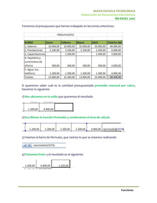 El documento describe varias funciones útiles en Excel como la suma, promedio y otras funciones matemáticas y estadísticas. Explica cómo acceder a las funciones a través del botón de fórmulas y cómo utilizar funciones como la suma para totalizar rangos de celdas o cantidades individuales. También muestra cómo nombrar rangos de datos para facilitar el uso de funciones como la suma sobre esos rangos sin necesidad de seleccionar celdas manualmente.