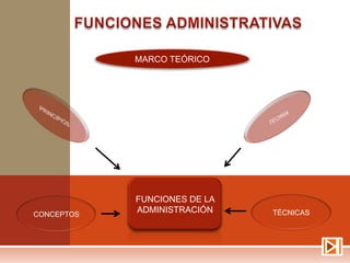 Este documento presenta las funciones básicas de la administración: planeación, organización, integración del personal, dirección y control. Define cada función de la siguiente manera: la planeación implica proyectar el futuro de una organización estableciendo objetivos y acciones; la organización establece una estructura de roles para cumplir metas; la integración del personal llena los puestos de la estructura; la dirección influye sobre las personas para lograr las metas; y el control mide y corrige el desempeño para asegurar el cumplimiento de
