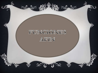 La función afín se define como una función cuya expresión algebraica es de la forma y=m*x+b, donde m y b son números. La gráfica de una función afín es una recta que no pasa por el origen y su pendiente m y ordenada en el origen b determinan si la función es creciente o decreciente. Las funciones afines son continuas y se pueden representar con una línea.