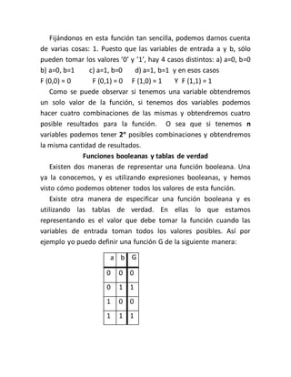 El documento explica las funciones booleanas, que son funciones matemáticas que toman valores booleanos (0 o 1) como entrada y salida. Se definen funciones de una y dos variables como ejemplos, y se explica que para n variables de entrada hay 2n posibles combinaciones de salida. También se introducen las tablas de verdad como otra forma de representar funciones booleanas, y cómo obtener expresiones booleanas a partir de tablas de verdad en forma canónica de sumas de productos (minitérminos) o productos de sumas (máxiterminos).