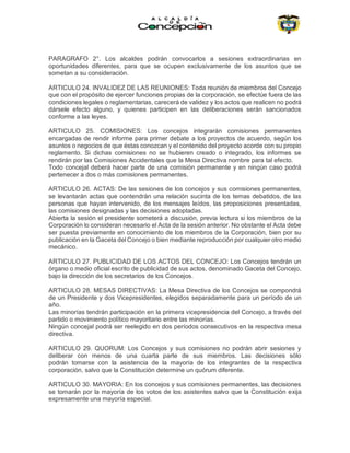 Este documento establece las normas sobre la composición y funcionamiento de los concejos municipales en Colombia. Indica que cada municipio tendrá un concejo municipal integrado por un mínimo de 7 y un máximo de 21 miembros electos popularmente por períodos de 3 años. Define el número de concejales según la población del municipio. Establece las atribuciones de los concejos, como disponer sobre policía municipal, aprobar el presupuesto y ejercer control sobre la administración.