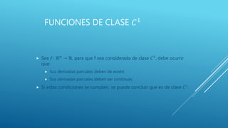 Este documento explica las condiciones que una función debe cumplir para ser considerada de clase C1, C2 o Cn. Para ser C1, una función debe tener derivadas parciales existentes y continuas. Para ser C2, debe cumplir lo anterior y también tener derivadas parciales de segundo orden existentes y continuas. Para ser Cn, debe cumplir lo anterior para derivadas parciales de orden n. Se proveen ejemplos para ilustrar estas definiciones.