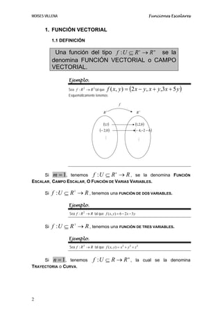 Este documento presenta conceptos fundamentales sobre funciones escalares. Primero define funciones vectoriales y escalares, y explica que una función escalar es una función de varias variables cuya salida es un escalar. Luego describe cómo graficar funciones escalares, definir su dominio, y calcular sus conjuntos de nivel. Finalmente, introduce conceptos como límites, continuidad y derivadas para funciones de varias variables, necesarios para el estudio de funciones escalares.