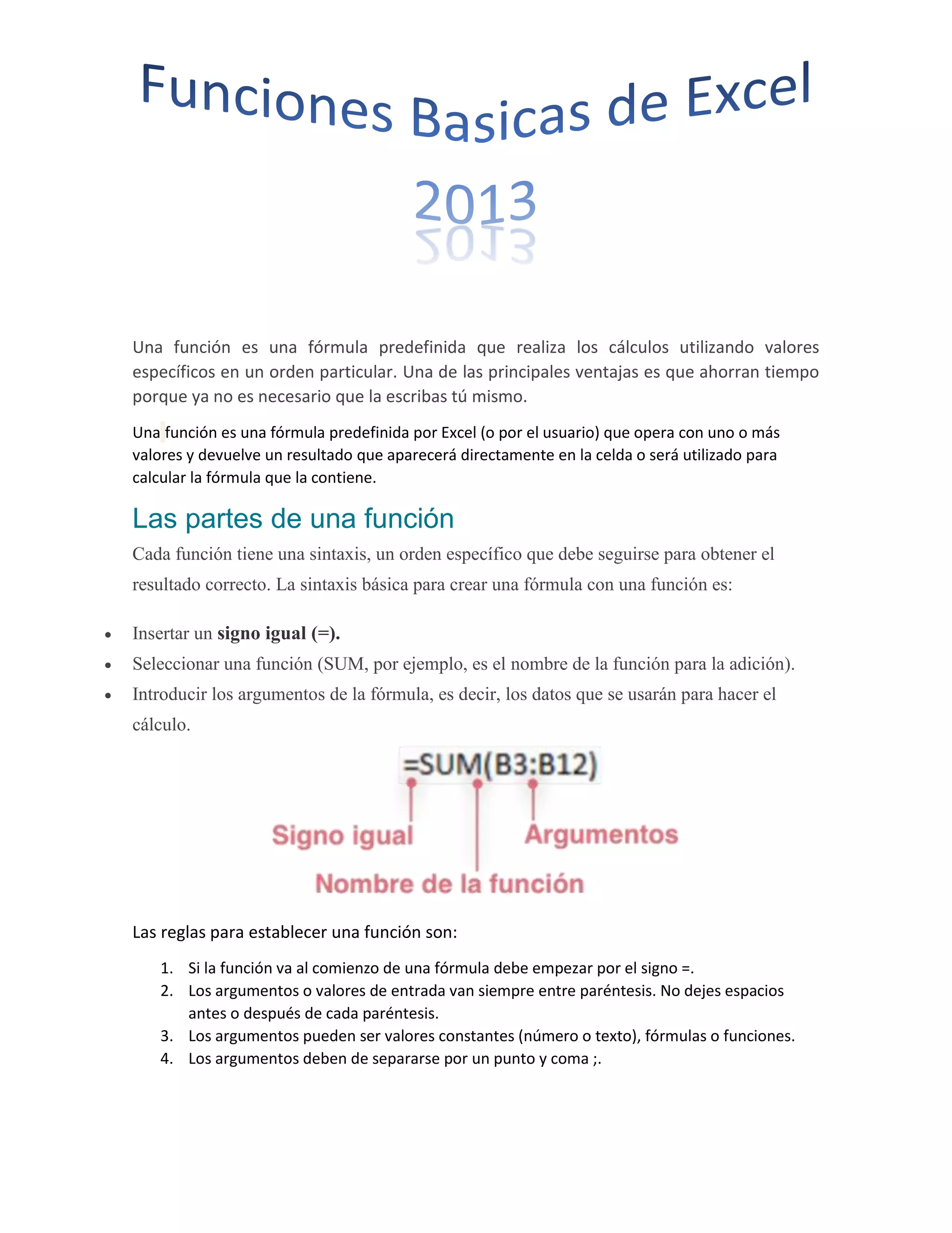 Este documento describe las funciones en Excel. Explica que una función es una fórmula predefinida que realiza cálculos usando valores específicos en un orden particular. Detalla las partes de una función, incluyendo la sintaxis y los argumentos, y proporciona ejemplos de cómo usar funciones comunes como PROMEDIO, MAX y SUM. También enumera categorías de funciones como estadísticas, matemáticas y de fecha y hora.