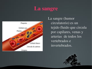 La sangre es un tejido fluido que circula por el cuerpo y está compuesto de células y componentes extracelulares. Contiene glóbulos rojos que transportan oxígeno, glóbulos blancos que combaten infecciones, plaquetas que ayudan a la coagulación de la sangre, y plasma con agua y proteínas. Los glóbulos rojos carecen de núcleo y contienen hemoglobina para transportar oxígeno y dióxido de carbono, mientras que los glóbulos blancos y plaquetas ay