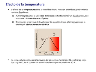 Este documento describe los principales factores que afectan la actividad de las enzimas, incluyendo cofactores, temperatura, pH, concentración de sustrato e inhibidores. También explica cómo la temperatura óptima y el pH óptimo varían entre enzimas, y cómo la velocidad de reacción depende de la concentración de sustrato siguiendo la ecuación de Michaelis-Menten. Además, señala que los inhibidores y los moduladores alostéricos regulan la actividad de las enzimas.