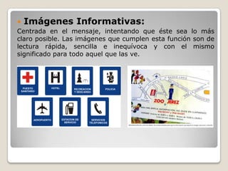 El documento describe diferentes tipos de imágenes basadas en su función y complejidad. Identifica imágenes informativas, poéticas y persuasivas que buscan comunicar información, sugerir ideas o vender productos respectivamente. También describe imágenes fáticas, originales, redundantes, simples, complejas, monosémicas y polisémicas que se diferencian por su capacidad de llamar la atención, ser novedosas, repetitivas, de fácil o difícil comprensión o tener un único significado versus múltiples significados.