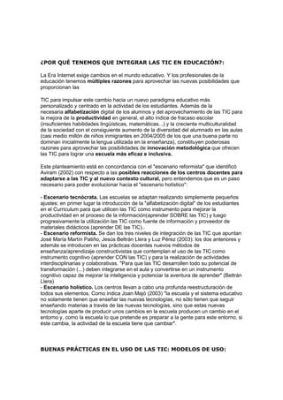 Las TIC tienen varias funciones importantes en la educación como la alfabetización digital, el uso como herramienta didáctica y cognitiva, la mejora de la comunicación entre escuela, familias y comunidad, y la necesidad de integrarlas para preparar a los estudiantes para la sociedad actual basada en la información. Existen diferentes modelos de uso de las TIC en la educación dependiendo del contexto.