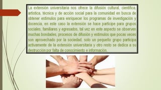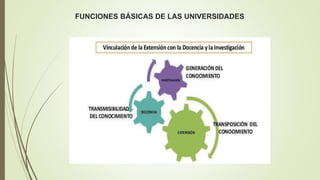 El documento discute las funciones básicas de las universidades de generar, difundir y evaluar el conocimiento a través de la docencia, investigación y extensión. Señala que es necesaria la integración de estas tres áreas para formar profesionales capaces de enfrentar los desafíos de la sociedad, y que la docencia debe estar vinculada a la investigación. También resalta la importancia de que los docentes reciban formación basada en investigación para entregar una educación más crítica y acorde a las demandas actuales.
