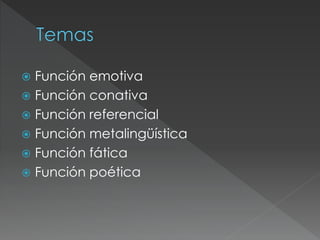 Este documento describe las seis funciones principales del lenguaje: la función emotiva, conativa, referencial, metalingüística, fática y poética. Explica que el lenguaje se usa para comunicar realidades, deseos, admiraciones, preguntas u órdenes, y que la función que cumple depende de cómo se utilizan las oraciones. Proporciona ejemplos de cada función y explica brevemente las formas lingüísticas asociadas.