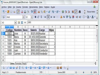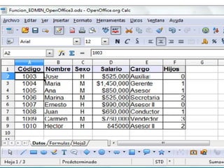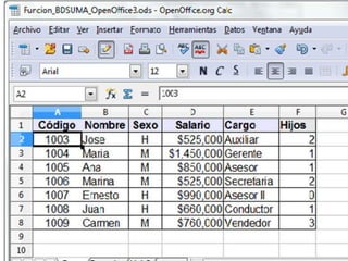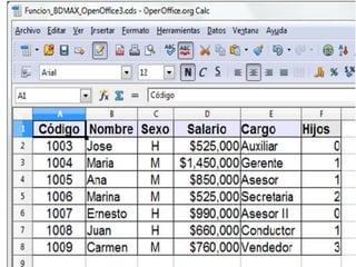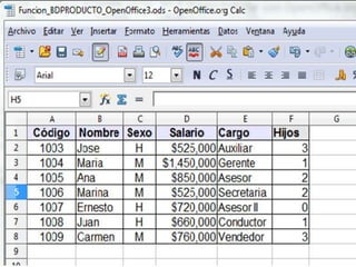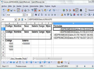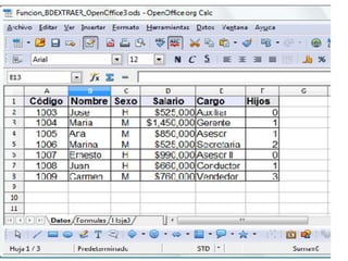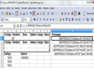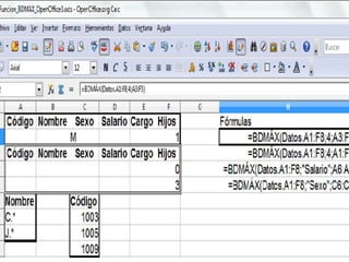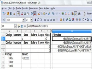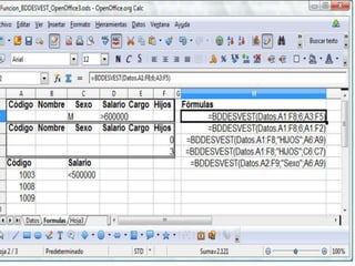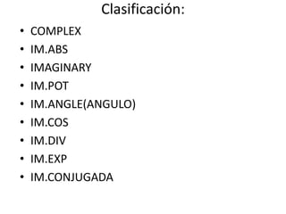 Este documento describe funciones matemáticas y de bases de datos. Las funciones matemáticas trabajan con números complejos, mientras que las funciones de bases de datos extraen información de tablas de datos organizadas en filas y columnas.