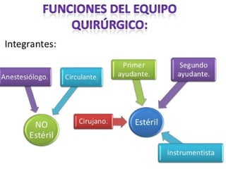 Este documento describe los roles y responsabilidades de varios miembros del equipo quirúrgico, incluyendo al cirujano, anestesiólogo, primer y segundo ayudantes, instrumentista y enfermera circulante. Cada rol tiene responsabilidades específicas para preparar el quirófano, asistir durante la cirugía, y cuidar al paciente antes y después de la operación.