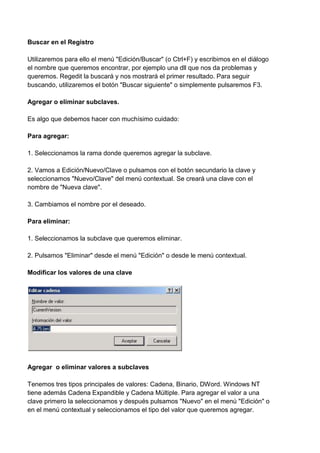 El registro de Windows almacena información sobre la configuración del sistema operativo, hardware y aplicaciones. Se puede usar el editor de registro (Regedit) para buscar, agregar, modificar o eliminar claves y valores en el registro, y también para exportar claves a archivos *.reg para hacer copias de seguridad de la configuración.