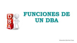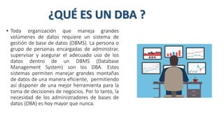 Un DBA es responsable de administrar y asegurar los datos almacenados en un sistema de gestión de base de datos (DBMS). Sus funciones incluyen modelado de datos, auditoría, respaldo y recuperación de datos, planificación de capacidad, administración de cambios y colaboración con desarrolladores de aplicaciones. Un DBA debe entender la tecnología de bases de datos y comunicar reglas y procesos a otros para garantizar el uso adecuado y seguro de los datos de una organización.
