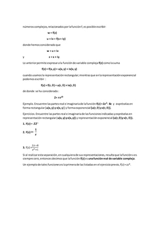 El documento describe las funciones de variable compleja, incluyendo su definición, representaciones gráficas y ejemplos de mapeos o transformaciones como traslación, rotación, inversión y reflexión. Una función de variable compleja asigna a cada número complejo z un número complejo w relacionado por la función f(z). Algunos mapeos comunes incluyen traslación f(z)=z+z0, rotación f(z)=re^{i(θ+θ0)} y rotación-escala f(z)=rz0.