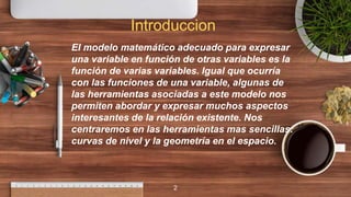 Este documento introduce las funciones de varias variables y los sistemas de coordenadas. Explica qué son las coordenadas y para qué sirven, y describe los sistemas de coordenadas cartesianas, cilíndricas, esféricas. También cubre conceptos como curvas de nivel, simetría, transformaciones entre sistemas de coordenadas, y geometría en el espacio, incluyendo superficies como la esfera, el cilindro, el paraboloide, el elipsoide e hiperboloide.