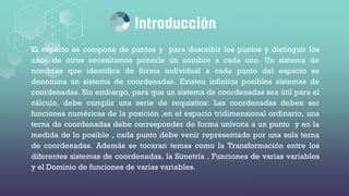 Este documento presenta información sobre sistemas de coordenadas. Explica qué son las coordenadas y cómo se usan para describir la posición de puntos en un espacio. Luego describe sistemas de coordenadas específicos como las coordenadas cartesianas, cilíndricas y esféricas. También cubre temas como la transformación entre sistemas de coordenadas y conceptos de simetría.