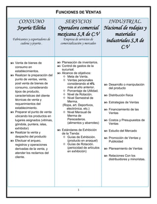 Este documento describe las diferentes funciones de ventas en empresas de consumo, servicios e industriales. Explica que las funciones dependen del tipo de empresa, producto, clientes y objetivos. Se debe considerar todos estos factores para establecer funciones adecuadas y lograr resultados favorables. Las funciones incluyen venta de productos, planeación, control de gastos, cumplimiento de metas y más.