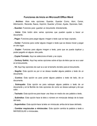Este documento describe las funciones principales de inicio en Microsoft Word, incluyendo opciones para abrir y guardar archivos, copiar, cortar y pegar texto e imágenes, aplicar formatos como negrita, cursiva y subrayado, cambiar el tamaño y color de fuente, agregar viñetas y numeración, alinear y justificar texto, y buscar y reemplazar palabras.